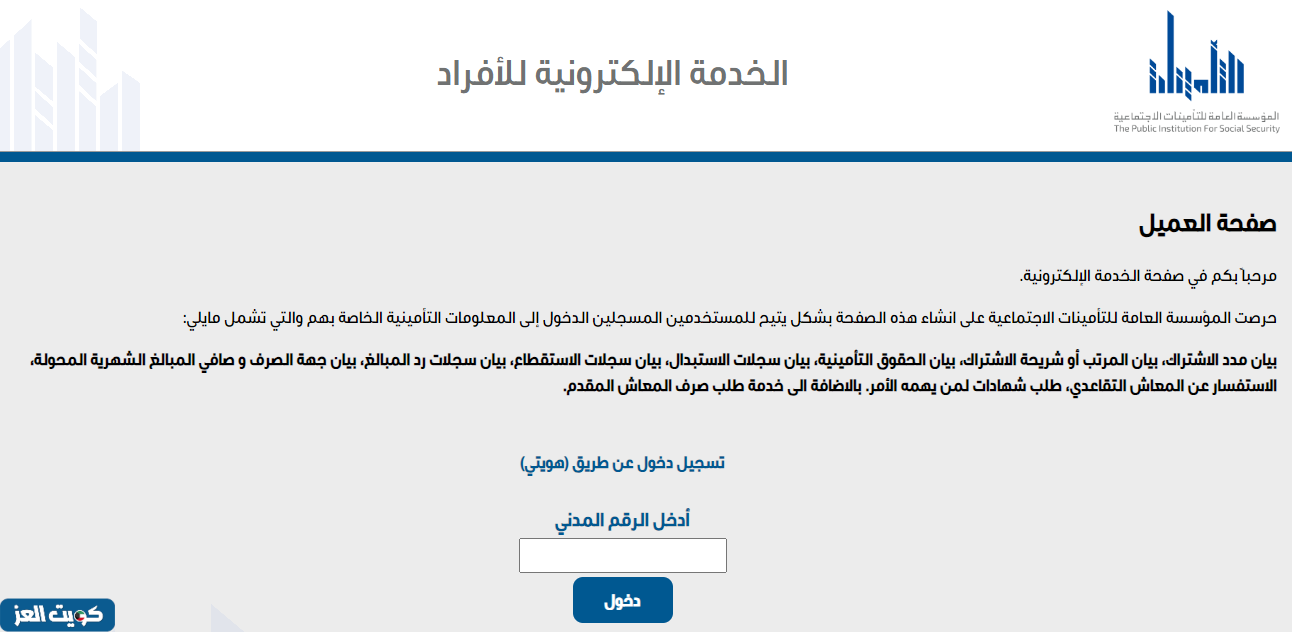 - ^ kuwaitplatform.com , طلب تأجيل أقساط التأمينات الاجتماعية للأفراد , 18/09/2024